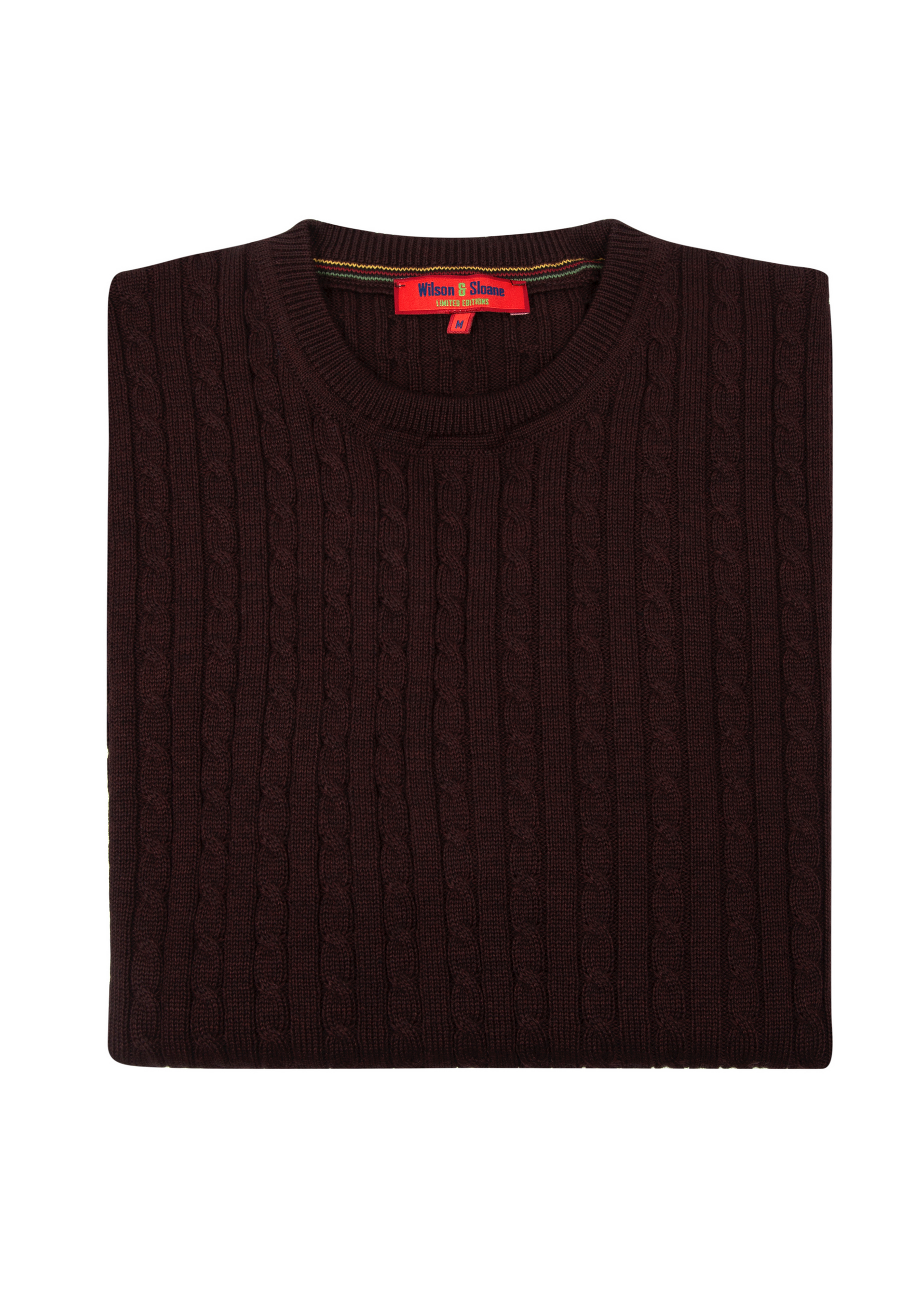 Men's Maroon Brown Mildura Wool Cable Knit Crew Neck Jumper